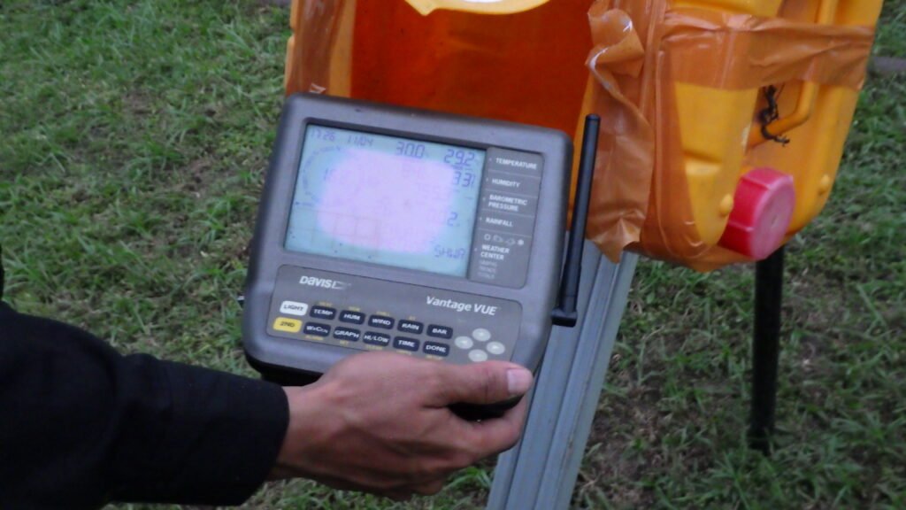 Dalam pekerjaan pemetaan tanah, survei geospasial, dan pengukuran topografi, kondisi cuaca memegang peran penting terhadap kualitas data yang dihasilkan. Foto ini memperlihatkan penggunaan perangkat Davis Vantage VUE, sebuah alat pemantau cuaca presisi yang sering digunakan dalam proyek survei lapangan untuk memastikan bahwa seluruh proses pemetaan dilakukan dalam kondisi aman dan optimal.
