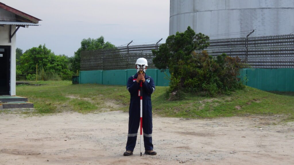Surveyor pada foto bekerja menggunakan total station, sebuah alat yang sangat dibutuhkan dalam proses pengukuran lahan, pemetaan area industri, dan monitoring deformasi struktur. Pengukuran ini bertujuan untuk mencari data akurat mengenai elevasi, jarak, bentuk lahan, serta perubahan kontur tanah yang dapat mempengaruhi kestabilan fasilitas penyimpanan.